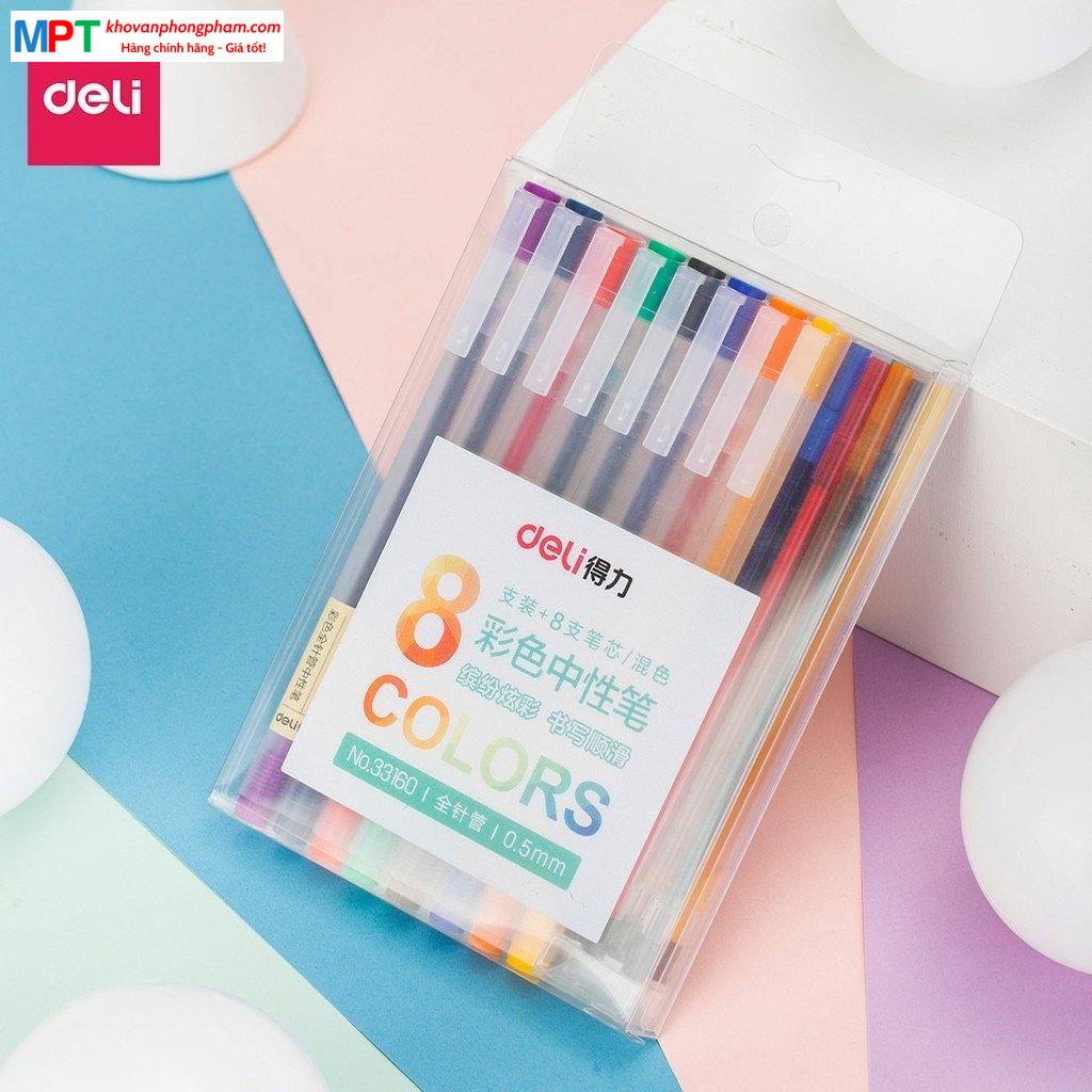 Bộ 8 bút nước nhiều màu Deli 33160 ngòi 0.5mm kèm 8 ống mực thay thế