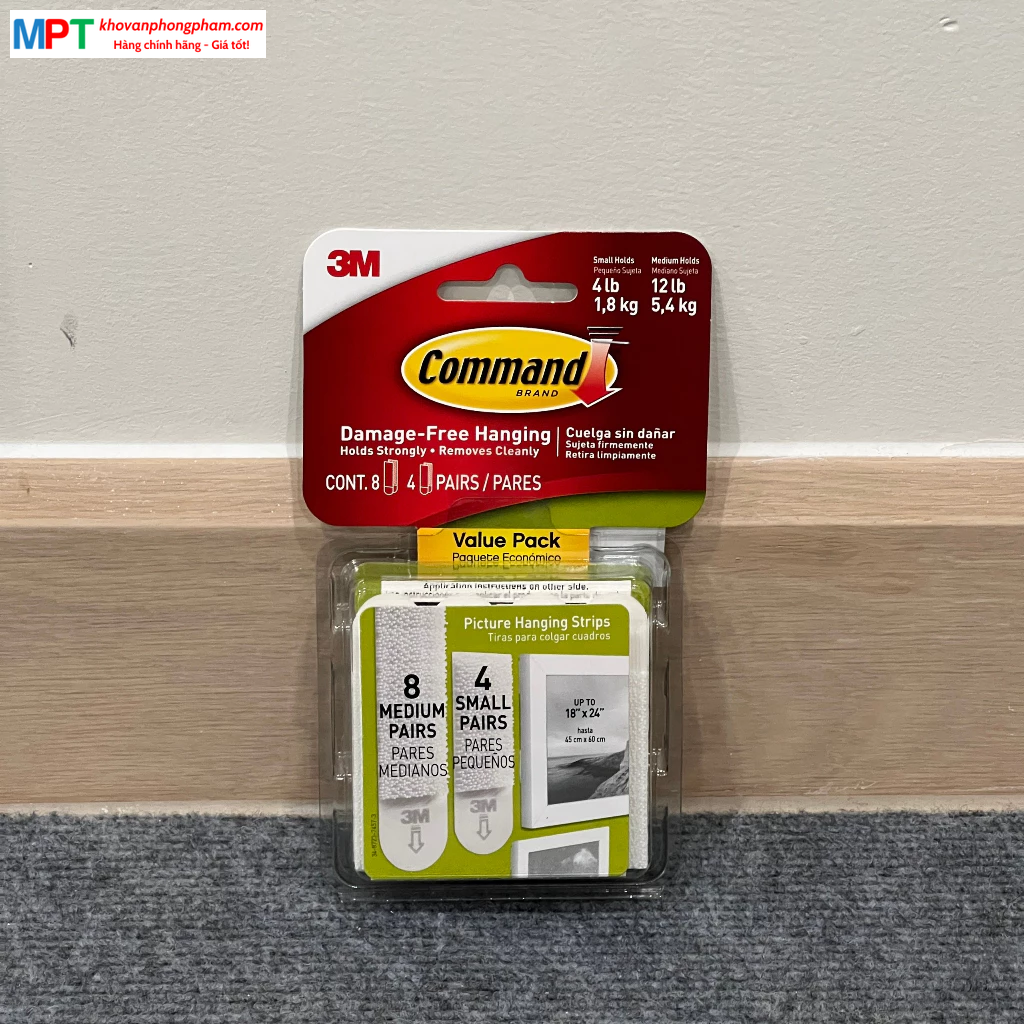 Miếng dán treo tranh 3M Command 17203-ES - Màu trắng, chịu tải 5.4kg - Vỉ 8 miếng vừa, 4 miếng nhỏ (Nhập khẩu bởi 3M Việt Nam)