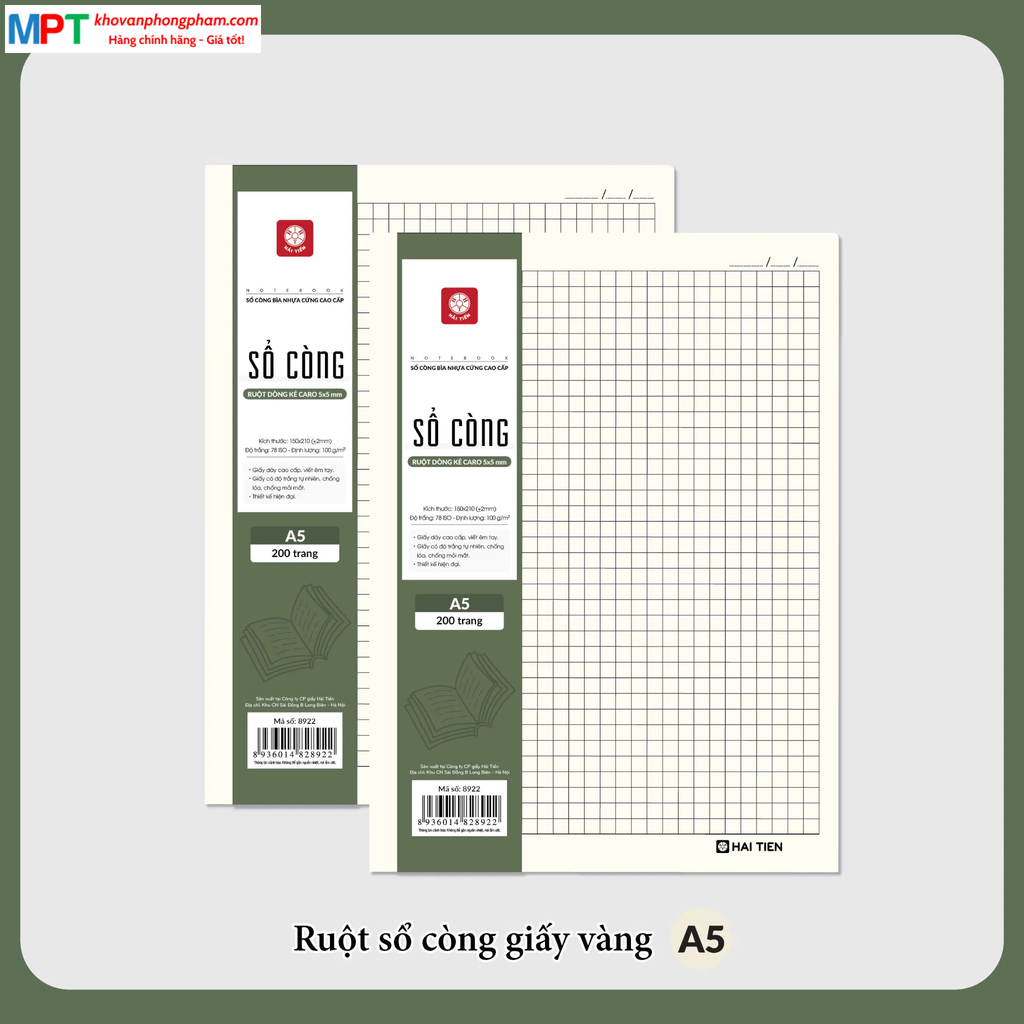 Ruột sổ còng giấy vàng chống lóa khổ A5 Hải Tiến 200 trang 8922 - Dòng kẻ caro, KT: 150x210mm - Định lượng 100gsm