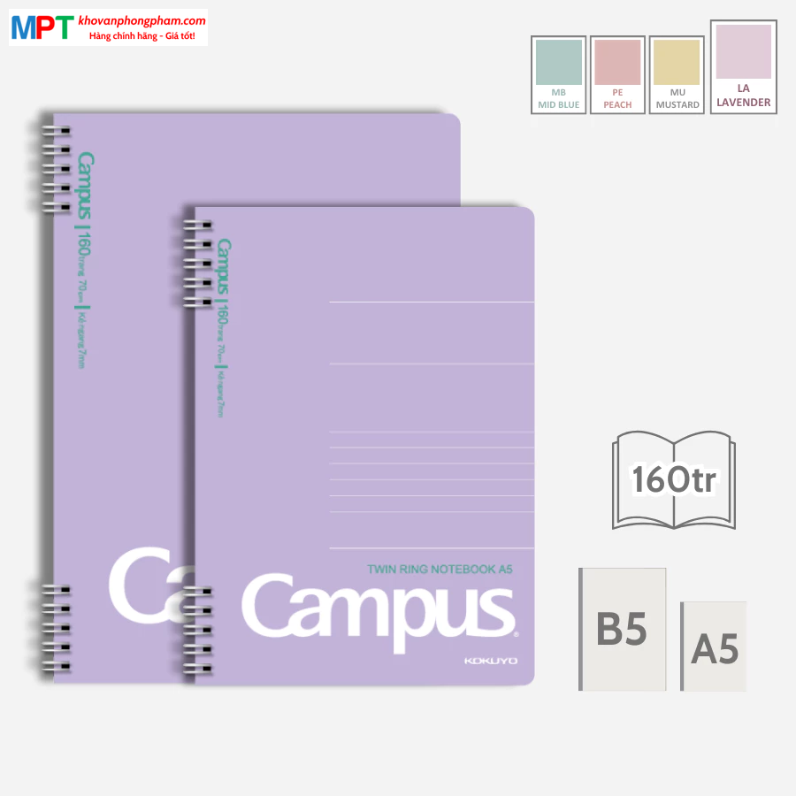 Sổ lò xo A5 Campus KUSUMI 2 đầu 160 trang - Dòng kẻ ngang - Định lượng 70gsm, kích thước 148x210mm